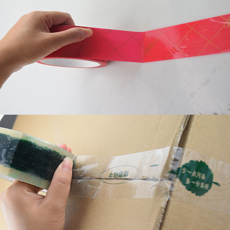 Material: Recycled cellulose (wood pulp + cotton pulp) Product width: 44mm,49mm,60mm,72mm(customizable) Product length: 30m,50m,100m(customizable) Product thickness: 50μm ±2 Product temperature: (-20℃~65℃) MIN~ MAX Product type: Pattern, logo can be customized, printing up to 2-3 colors Initial viscosity: ≥20 180° peeling force (N/25mm): ≥9.9 Tensile strength: ≥95 Product retention (h):≥48 Product features: low noise, anti-static, high and low temperature resistance, easy to tear, strong tensile strength, recyclable, extensibility, good air permeability, writable |